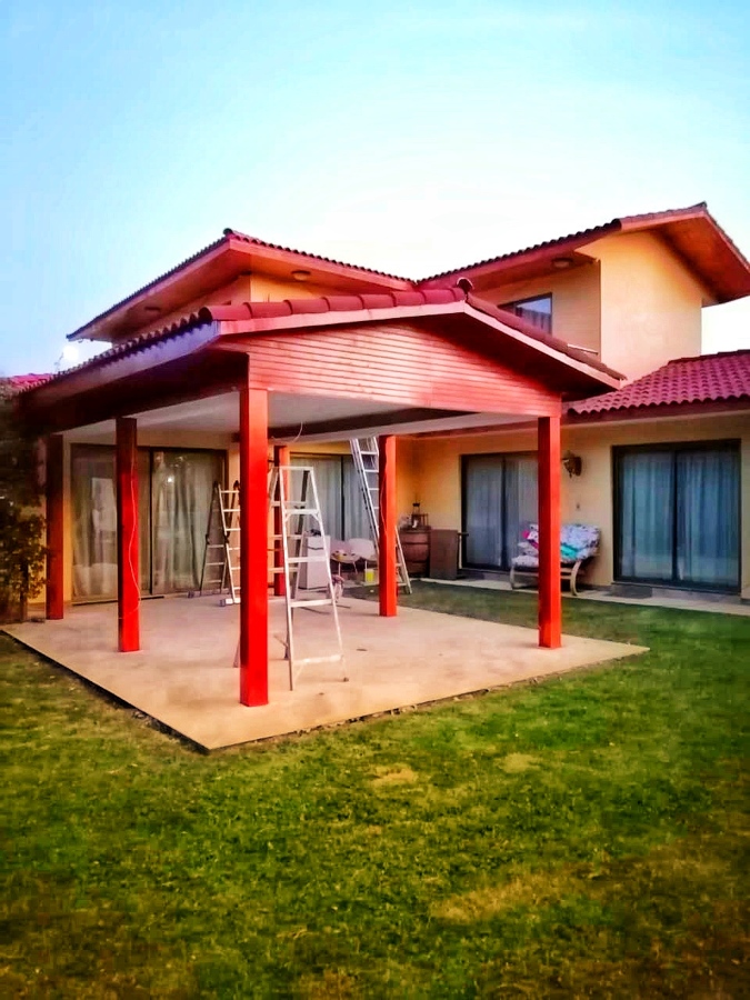 Se realizó el retiro completo de cerámicos deteriorados debido a una mala preparación de superficie. Tras eliminar las capas de pintura antiguas, se procedió a la nueva instalación de cerámicos y pintura texturizada en todo el perímetro. Además, se reemplazó parte del alero, se restauró el hastial de la cubierta, se instalaron nuevas canaletas y bajadas de aguas lluvias, y se fabricó una nueva reja con portón corredero con terminación en puntas dobles superiores.
