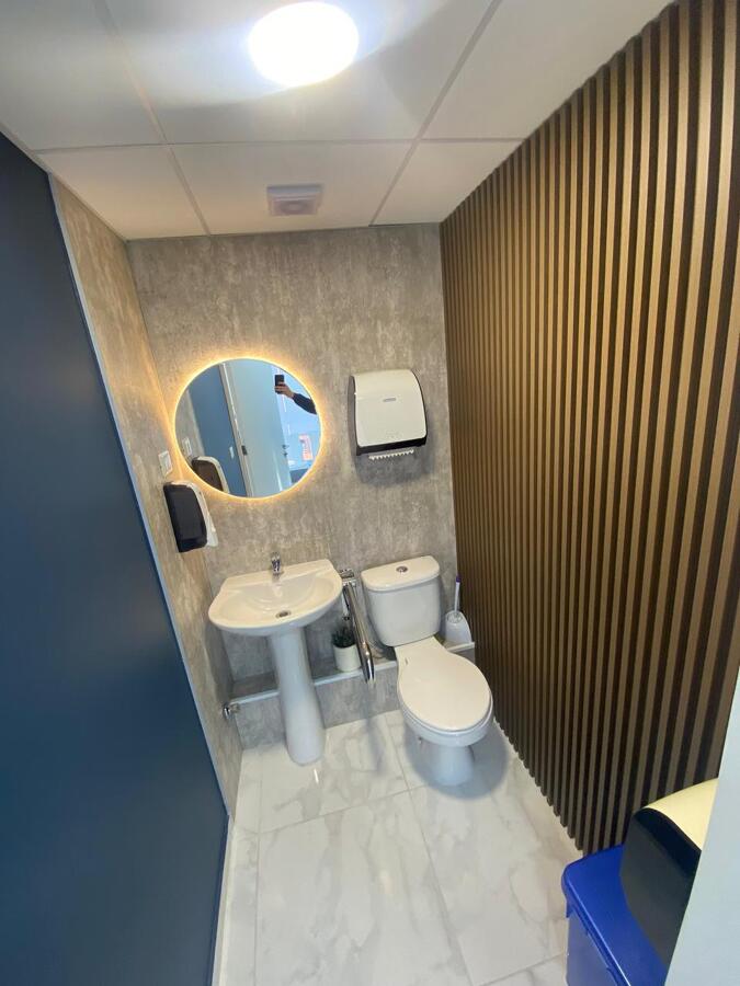 Baño moderno con diseño minimalista, que combina tonos neutros y materiales de alta calidad. El muro con listones verticales aporta calidez y textura, mientras que el espejo circular retroiluminado crea un ambiente elegante y funcional. Los revestimientos tipo mármol en el piso completan un espacio limpio, armónico y visualmente sofisticado.